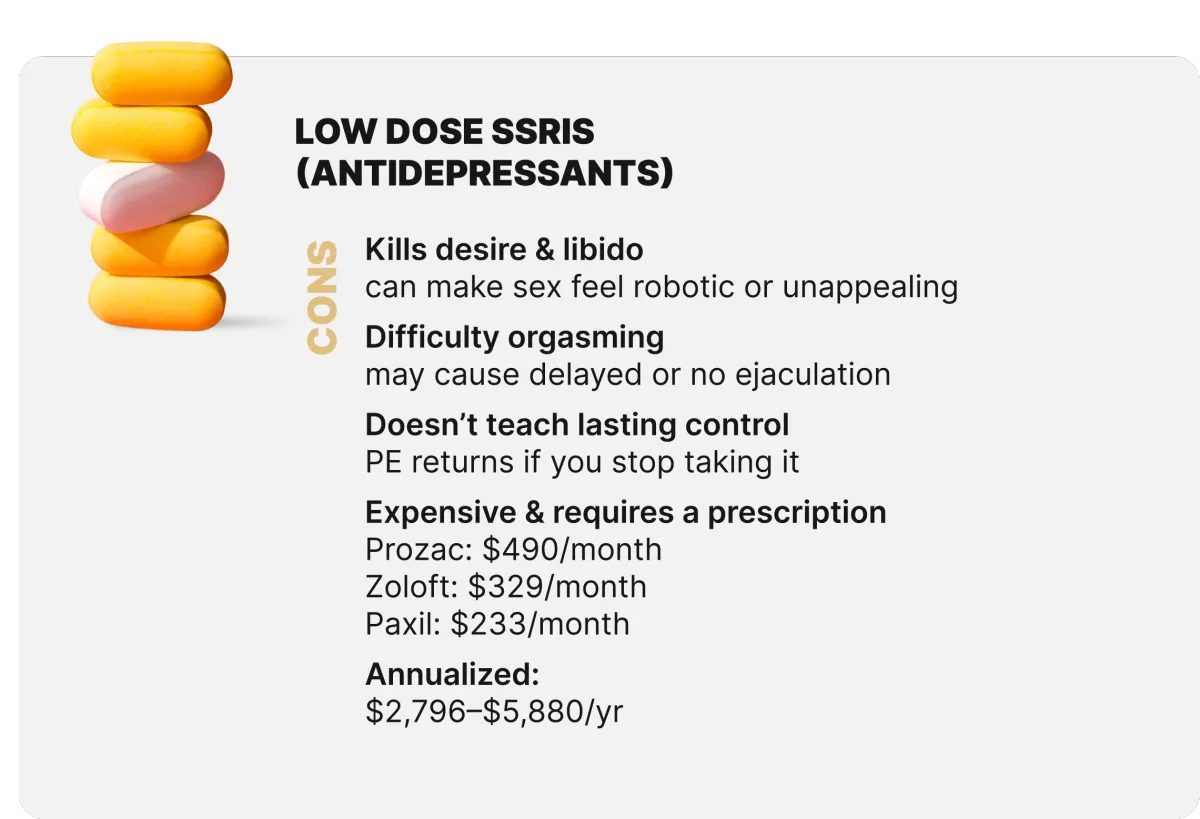 Often these patterns reflect over-tension + under-sensation + pacing issues. We train pressure literacy, pelvic relaxation/activation balance, breath-based arousal cycling, and attentional re-sensitization—so effort drops and sensation clarity rises. If you’re on SSRIs or have neuropathy or endocrine issues, also consult a clinician.